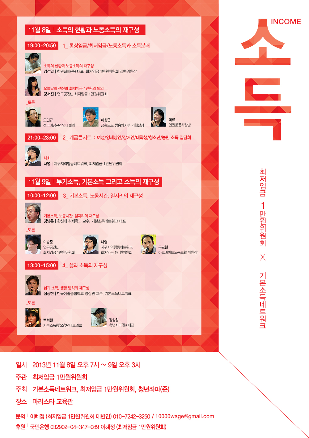 [행사] 기본소득한국네트워크 최저임금1만원위원회 청년좌파(준) 공동주최 <소득> 토론회
